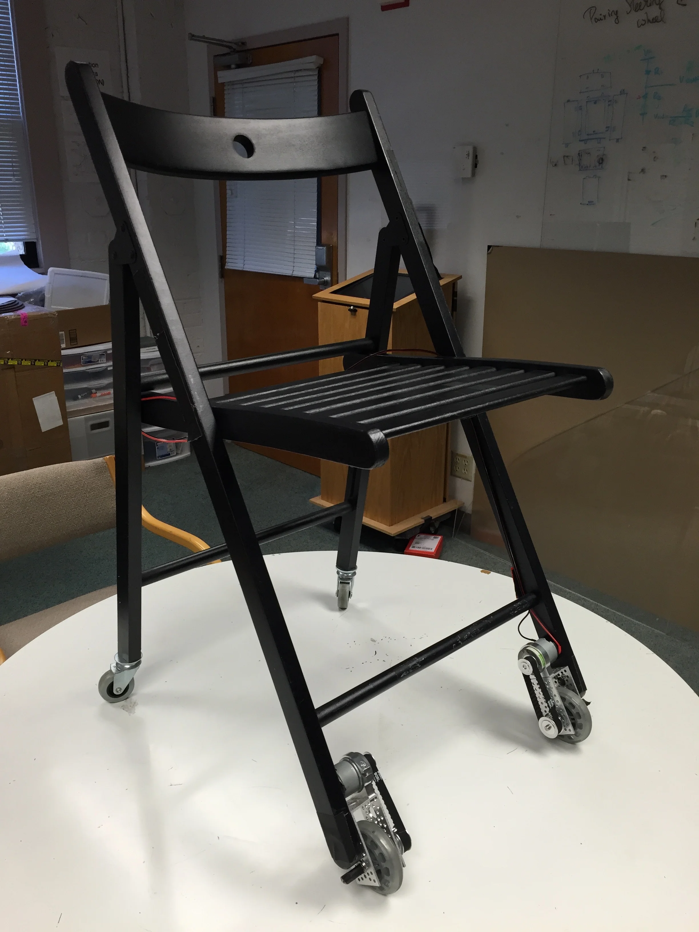 An exploration into Human Robot Interaction! I made initial prototypes for a Wizard of Oz controlled Chairbot with the Stanford DesignX Center for Design Research. Using Arduino and Raspberry Pi, I built a belt-driven, front-wheel drive chair that could be remote-controlled via wifi for prototyping human interactions with autonomous furniture.